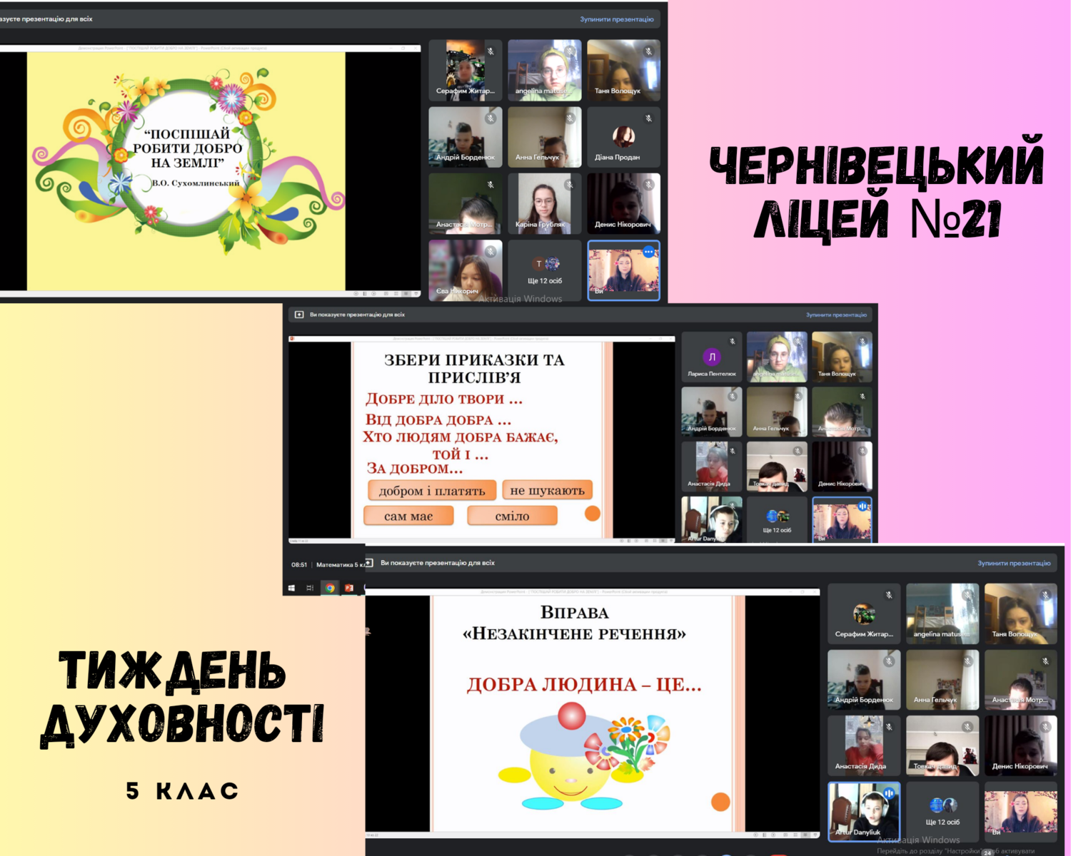 Протягом 03.04.2023-07.042023 у Чернівецькому ліцеї # 21 відбувся Тиждень духовності. Він проходив в дусі національно- патріотичного виховання на засадах християнських та загальнолюдських цінностей . Учні ліцею із задоволенням взяли участь у різноманітних заходах. Були проведені години спілкування на теми духовності, онлайн - подорож " Сторінками священної Книги ', перегляд та обговорення відеоролику " Які бувають цінності?', онлайн - челенджі " Малюнки на біблійну тематику" та " Подаруй любов тваринці ' ,виставка християнської літератури.